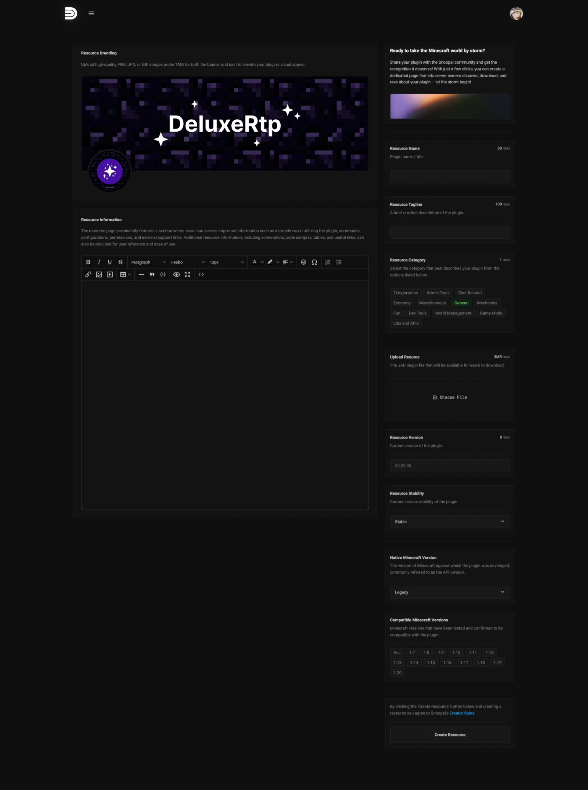 A streamlined dashboard designed to make publishing and managing plugins simple, featuring clear guidance, category selection, and an intuitive WYSIWYG editor for writing and formatting resource pages.